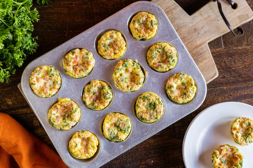 Using a rubber spatula, loosen frittatas from the cups and slide onto a platter.