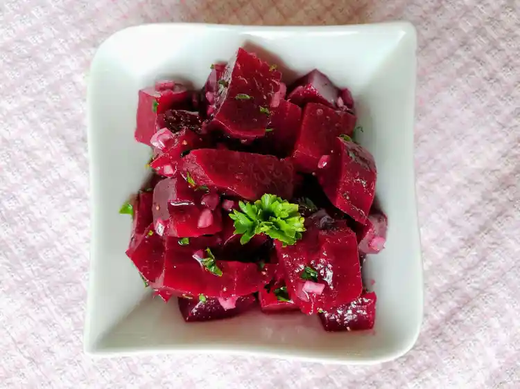Cube the peeled beets, delicata, and red onions into half inch cubes and place on a lined sheet pan.