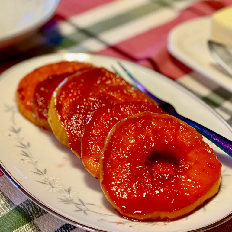 While syrup is simmering, core, but don’t peel, apples and slice into 1/4 inch thick rings. Cook half of the rings at a time in the syrup. Simmer until tender but firm, 5-10 minutes…you don’t want the apples to get mushy or fall apart. Remove the first half of apple rings and cook the second half in the same syrup (if it gets too thick, add a little extra water).