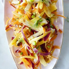 Prepare the carrots by slicing off their ends and peeling off the outer layer. Then, use a vegetable peeler to create thin shavings. Prepare the fennel by removing the stalks and any discolored outer pieces. Keep the bulb and its core intact, and use the vegetable peeler to make shavings from the bulb until you reach the center. (It's a lot easier to peel a whole fennel bulb than it is to peel individual pieces of fennel.) When you get to a point where it becomes difficult to keep shaving the veggies, thinly slice whatever is left. Be sure to remove and discard the fennel core.