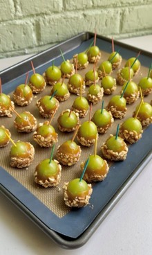 4. Working one by one, dip each grape into the caramel, let the excess drip off, then immediately roll in the chopped peanuts.