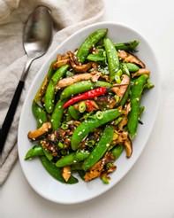 · Add the sesame oil and when it’s fragrant stir in the sugar snap peas.