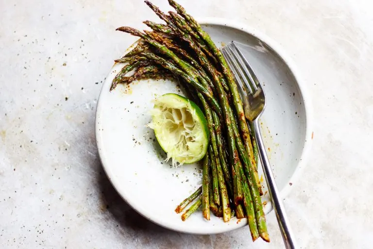 A Mexican inspired asparagus is flavored with chili powder and lime juice and zest. A naturally vegan and gluten-free asparagus recipe ready in twenty minutes.